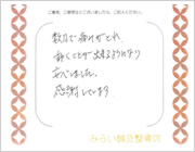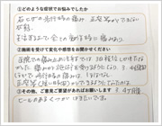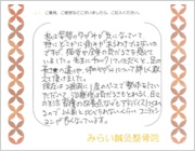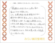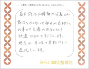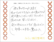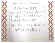 腰を動かすことが出来ず、咳やくしゃみでもひびく位の痛みでしたが、鍼治療をしてもらった後は、うそのように痛みもとれ、楽になりました。