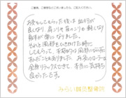 お灸してもらった後は血行が良くなり、肩凝りや首の凝りも軽くなり身体が楽になりました。