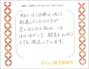 今まで鍼治療は怖くて敬遠していたのですが、足のむくみも取れ、1日ほかほかして、顔色もよくなりとても満足しています。